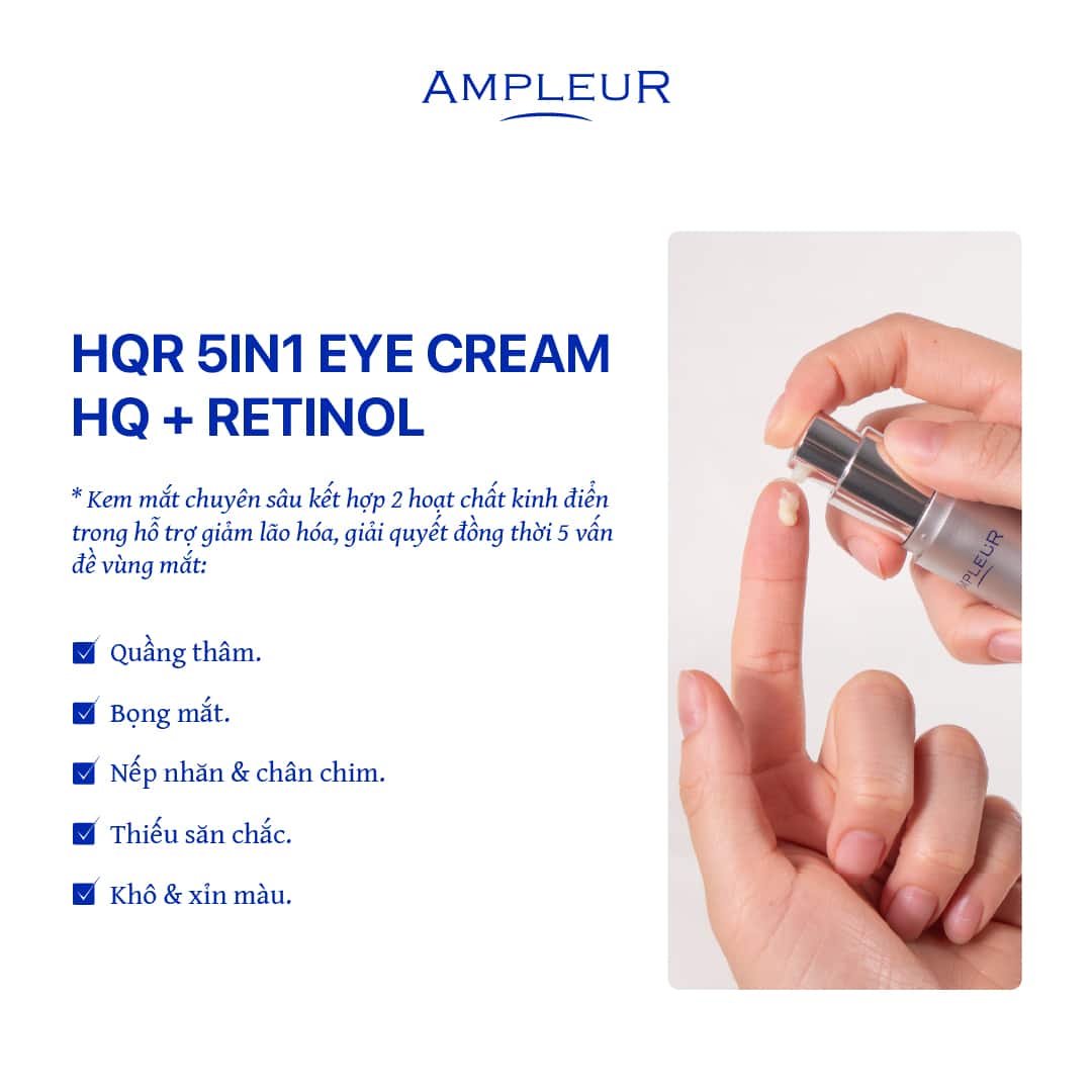 Kem mắt HQR 5in1 kết hợp 2 thành phần tiên tiến “Hydroquinone và Retinol” chăm sóc 5 vấn đề chính về mắt (khô, dấu hiệu lão hóa ở khóe mắt, thiếu độ săn chắc, quầng thâm dưới mắt và vết xỉn màu):