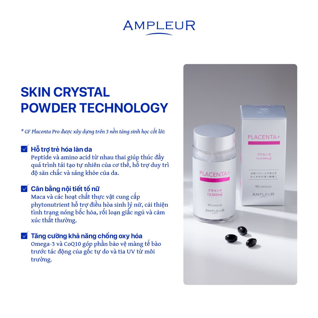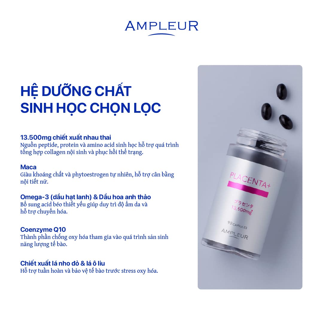 - Chứa 13.500mg chiết xuất “nhau thai” tự nhiên mang lại sức khỏe và vẻ đẹp từ bên trong cơ thể